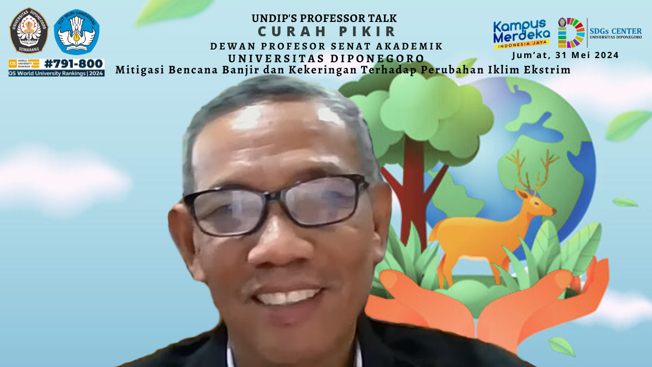 Dewan Profesor Senat Akademik Universitas Diponegoro (UNDIP) menyelenggarakan kegiatan Webinar “UNDIP’s Professor Talk” Curah Pikir Dewan Profesor Senat Akademik Universitas Diponegoro pada Jum’at, tanggal 31 Mei 2024 pukul 13.00 WIB secara daring melalui Zoom meeting dan disiarkan secara langsung melalui Official Youtube UndipTV dengan tema “Mitigasi Bencana Banjir dan Kekeringan Terhadap Perubahan Iklim Ekstrem”.